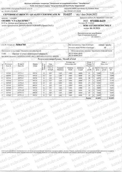 При виготовленні котлів використовується жароміцна, котлова сталь 09Г2С. Застосування сталі даної марки є запорукою зносостійкості і міцності котла.
